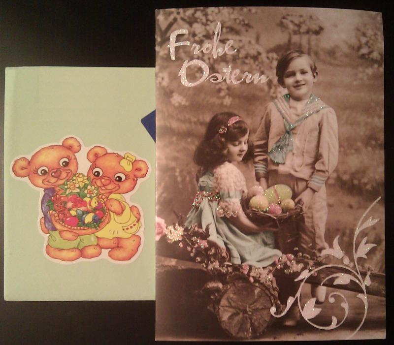 Какая прелесть! Очень хорошие открытки! И столько много! На многих иностранных - зайчики. Это здесь символ Пасхи. Считается, что Пасхальный зайчик приносит детям корзинки с крашенными яйцами.