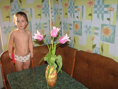 Оля, мы такие-деловые. Ух ты какой у тебя молодец, вроде маленький, а уже маме цветочки дарит!