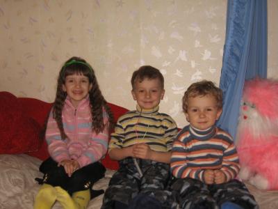 О нашла фото , Это Кэт, Артем и Федечка в феврале этого года Кате -6,5, Артему - 5,5, а Федору почти 3. Мама смеялась сказала, что на всех одно лицо.