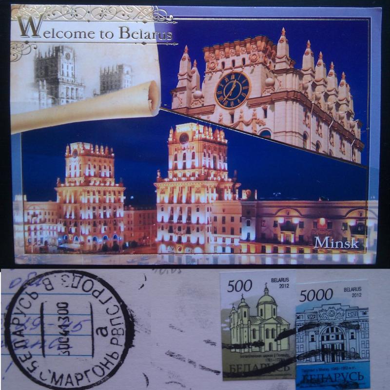 Замечательная открыточка с привокзальной площадью города Минска и двумя марками: Богоявленский собор в Полоцке и почтамт Минска. Таня, мне не просто понравилась, а очень-очень понравилась