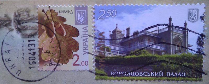 Чудесный привет из Киева от Даши, так же с двумя марками: листик дуба с желудями и Воронцовский дворец. Очень приятная открытка в ретро стиле и новая для меня марка