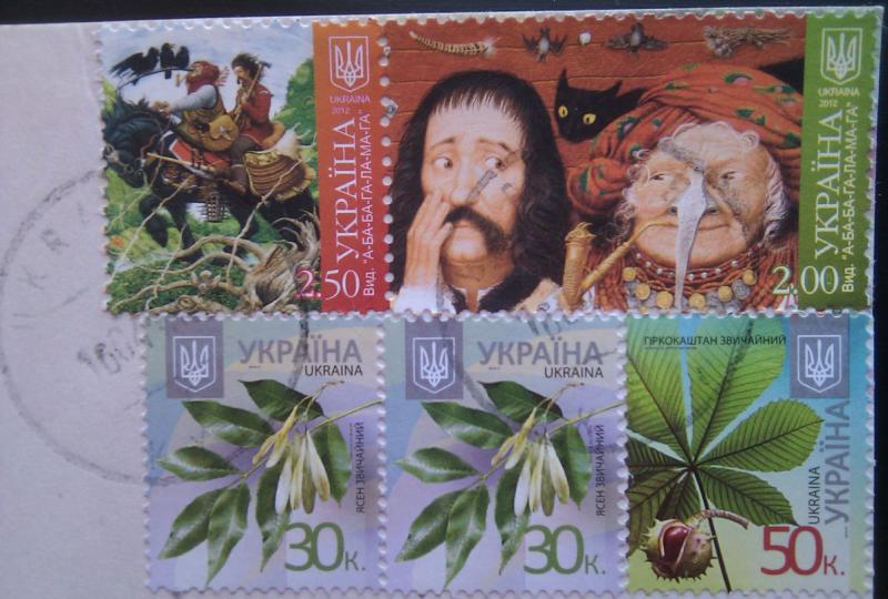 И еще одна бесподобная открыточка с панорамой Киево-Печерской лавры от Оли, сразу с пятью марками: два листочка ясеня, один лист каштана и две дивные марки, которые не знаю как обозвать, но они очень интересные. И черная киса как выглядывает, ааа