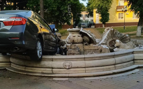Машина влетела в фонтан и снесла какую-то статую, это, судя по оставшемуся постаменту и кажется куску ноги на нем (сейчас даже непонятно, кто или что это раньше было), с того места, где я сейчас стояла, было видно, что от красивой мордашки не осталось и следа...