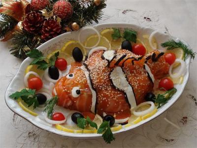 Переложить в плоское блюдо, сформировать дракона, выложить плотно чешую из киви, из белков- глаза, зрачки можно из черного перца горошка, лапки и хвост из целых огурцов, хребет и ушки из половинок, язык из помидорки(например).