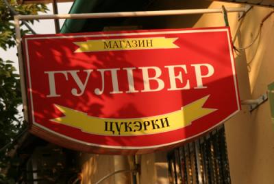Что самое интересное, с обратной стороны вывески это слово написано через "є" - это "е" украинская.