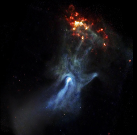 Наблюдение уникальной туманности стало возможным благодаря снимкам, сделанным "Хабблом". Мы можем угадать на них как бы поднятую руку с огненными бликами на кончиках пальцев— отсюда и название. Объект возник, как считают астрономы, в результате взрыва сверхновой звезды, который произошел миллионы лет назад. То есть Рука представляет собой облако газа и пыли, распространяющееся по космическим просторам. А вот радужный "файервол" - это рентгеновское остаточное излучение. Оно стало результатом взаимодействия движущихся заряженных частиц, ускоренных магнитными полями внутри туманности.