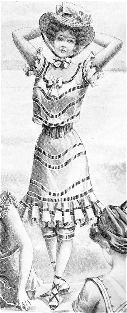 В XIX веке женский купальный костюм впервые разделился на две составляющие. Теперь он состоял из платья до коленей и леггинсов, спускающихся до щиколоток.
