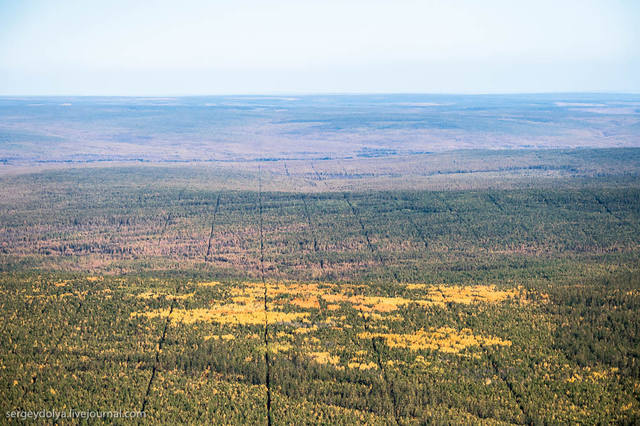 Кто-то скажет, что это следы, оставленные техникой геологов. Угу… Вы по якутской лесотундре хотя бы раз путешествовали? Вот и не говорите, коли не знаете. Здесь же мы видим идеально прямые линии длиной десятки километров. И проведены они так, словно перепады высот для устроителя этого всего, не имели никакого значения. Но ведь препятствием являются не только возвышенности и впадины, но и болота с трясинами, где вообще никакая техника пройти не в состоянии.