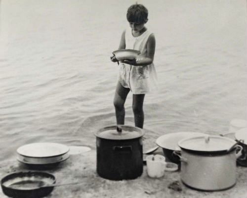 Посуду в реке мыли мы вдвоем с Таней, а Сашка от этого действа категорически отказался, но согласился таскать посуду на берег и назад.