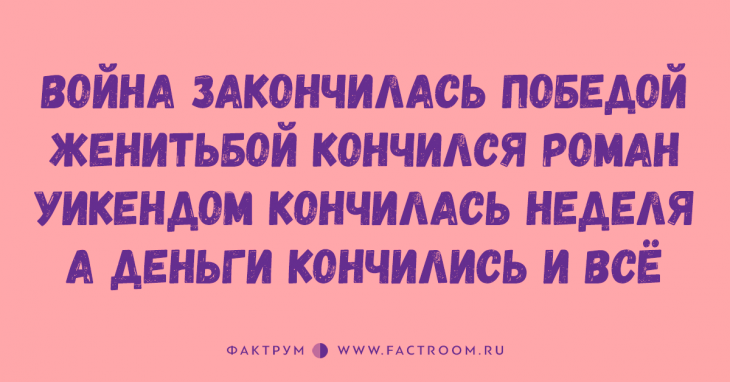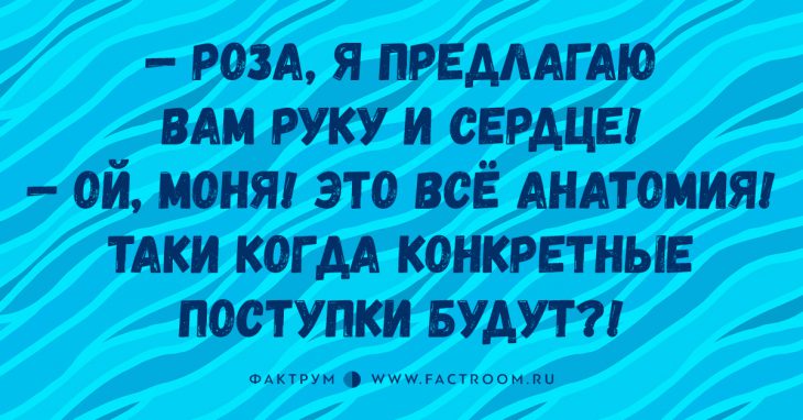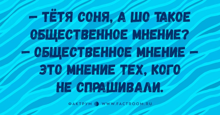 На передних сидениях едут две бабушки. Маршрутка почти полная. На остановке заходит парень. Передает водителю 10 рублей за проезд и получает сдачу - 1 рубль. Рубль из рук выскальзывает и падает под сиденья бабушкам. Парень наклоняется, пытается найти сдачу и, неожиданно, пукает. В маршрутке - тихий смех, хихиканье. А одна из бабушек говорит другой: "И стоило из-за рубля так жопу рвать!" Маршрутка взрывается от хохота. Парень становится пунцовым и просит остановить маршрутку. Через минуту в маршрутку заходит солидная дама. Маршрутка продолжает смеяться. Дама начинает себя нервно осматривать. Может, это над ней смеются? Тут бабушки, покатываясь от смеха, начинают рассказывать даме историю с рублем. Дама тоже начинает смеяться и тут у нее из носа вылетает сопля и попадает на бабушек.... Дама просит остановить маршрутку. Едем дальше, покатываясь от смеха. Водитель тоже вместе со всеми хохочет, достает сигареты, закуривает, приоткрывает люк над головой. Выпуская дым в люк, обращается к бабушкам: "Вам под люком (падлюкам) не дует?" Салон взрывается от нового приступа смеха Водитель, поняв, что он сказал, вываливается из кабины, пританцовывая и угорает. Эта же маршрутка 20 минут спустя. Маршрутка с конечной остановкой "поселок Сахарный". Все сели, места заняты... Водила завел машину... Тут дверь открывает бабка... И тут же спрашивает у водилы: "Милок, у тебя конец Сахарный?". По маршрутке прошло легкое хихиканье... Водила не долго думая ответил:"Не знаю, не пробовал!". По маршрутке пошел открытый ржач! Бабка осмотрев ястребиным взглядом салон поняла, что свободных мест нету... И протягивая 10р. водиле сказала: "Возьми меня стоя!". Водитель вываливается из кабины в сугроб и трясется в истерическом припадке....