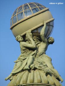 Стеклянный шар поддерживает скульптурная группа, символизирующая мореплавание. Угловую часть фасада украшают бронзовые девы-валькирии на рострах кораблей (в скандинавской мифологии они по воле бога Одина решали исход сражения). Одна из них держит в руках веретено и швейную машинку - символы легкой промышленности, другая - гарпун, символизирующий судостроение и тяжелую промышленность. На фасаде также можно увидеть атрибуты Меркурия (Гермеса), бога торговли: кадуцей - "посох вестника" - жезл, обвитый двумя змеями, и петаз - дорожная шляпа с крыльями.