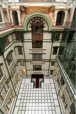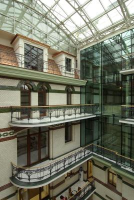 водосточных труб. Для того, чтобы не перегружать фасад здания лишними конструкциями, архитектор "спрятал" их, и дождевые воды отводятся по медным трубам внутри стен. Система вентиляции и кондиционирования была самой современной для начала XX в. Приточные вентиляционные камеры находились в подвале, воздух в помещения подавался очищенным, подогретым и увлажненным.