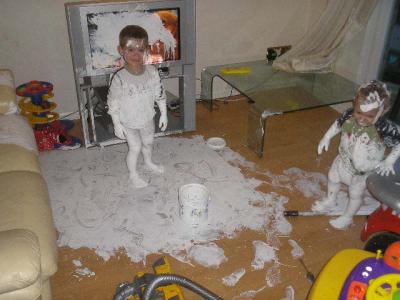 А у моей знакомой на днях, пока она по телефону разговаривала, мелкий на кухне 5 кг муки на пол высыпал, она заходит, а он масло подсолнечное сверху льет и руками "месит"... Вот такие они у нас помощники!