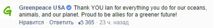 Официальный аккаунт Гринпис США в фейсбуке поблагодарил Йена за все, что он делает для нашей планеты.