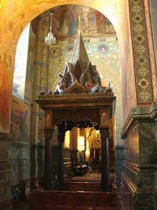 Особо подчеркнуто во внутреннем убранстве собора место, где упал смертельно раненный царь. При строительстве оно бережно сохранялось, тогда же над ним была выведена дивная сень, инкрустированная звездами из сибирских самоцветов и топазов.