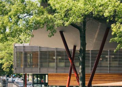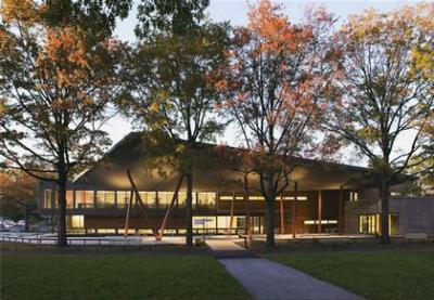 Архитекторы павильона в Ботаническом саду Квинс весь проект построили на экологических идеях. Здание интегрировано в ландшафт с помощью каналов (один рассекает постройку пополам), благодаря поросшей травой и вереском пологой крыше, постепенно спускающейся в сад.