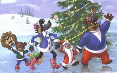 Ласточки волшебная открытка с елкой и кошкой. В красном конверте со снежинками
