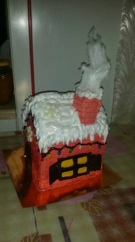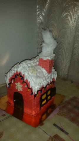 Вика, это бисквитные коржи и мастика. Крем на крыше какое-то жидкое бизе. Снежинки уже готовые продаются. Тесто сестра всегда сама месит и, поскольку она часто что-нибудь печет, уже хорошо знает все пропорции и нюансы.