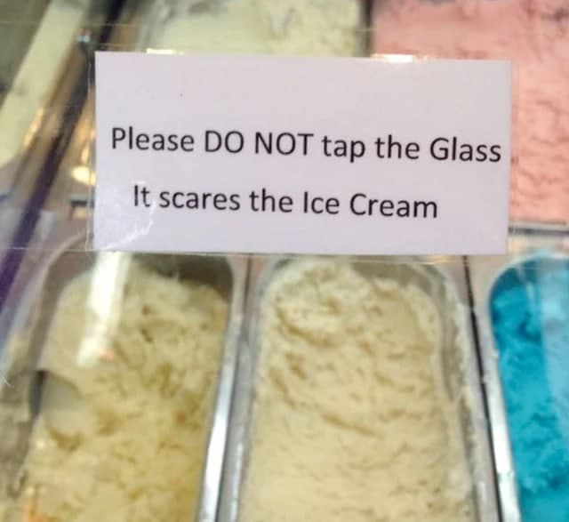 Надпись на витрине: «Пожалуйста, не стучите по стеклу, мороженое пугается»