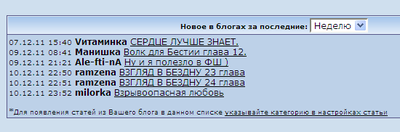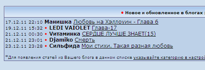 Вебмастер писал(а):Поскольку, как выяснилось, некоторые выкладывают новые главы в блогах не в новых статьях, а дополняя старые, мы изменили на странице Алфавитного списка выборку "Новое в блогах". Теперь туда попадают не только новые статьи, но и обновленные.
