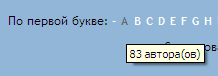 Здесь представлена алфавитная строка по аналогии с литературным каталогом, кликаете на букву - загружается список авторов, форумные ники которых начинаются на эту букву. Сколько таких авторов, можно увидеть во всплывающей подсказке при наведении мышки на букву: