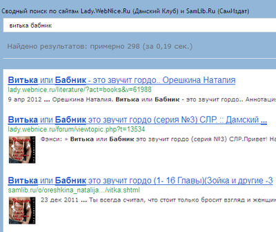 Поиск производится с учетом морфологиии русского языка, поэтому вам необязательно знать точное название произведения. Например, чтобы найти "Витька или Бабник это звучит гордо", можно ввести "витька бабник", "про витьку бабника", "витька фэнси", "витька орешкина" и даже "dbnmrf ,f,ybr" (в неверной раскладке):