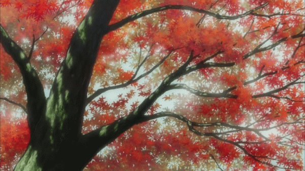 Напоминает средневековую японскую живопись, но как этот стиль идеально подошел к картине!!! А еще — поскольку листики клена момидзи играют особую смысловую роль в этом аниме, то прорисовки их уделено особое внимание —