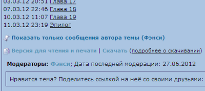 В первом сообщении тем разделов "Собственное творчество" и "Фанфики" у нас есть ссылка "Версия для чтения и печати", по которой можно посмотреть сообщения, вынесенные в заголовок, т.е., обычно, это главы произведения. Но иногда нам может потребоваться быстро найти и другие сообщения автора, не листая десятки страниц, например, нам интересны его ответы на заданные читателями вопросы или объявление об ожидаемой дате выкладке очередной главы или вообще узнать, когда автор в последний раз отмечался в теме. Для этого в первом сообщении теперь есть ссылка "Показать сообщения только автора темы", которая и покажет его сообщения в обратном хронологическом порядке, т.е. новые сообщения будут наверху: