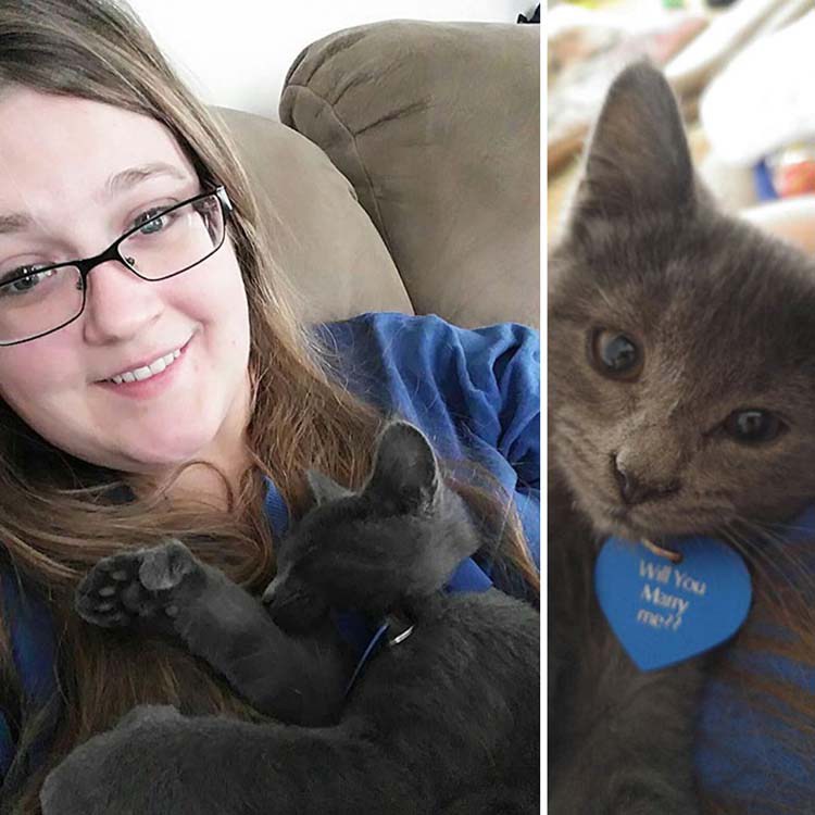 Пара, которая познакомилась два года назад на свидании вслепую, буквально не так давно решилась взять домой кота. Именно Кэт должна была посетить приют SPCA округа Эри, чтобы забрать животное. «Я думала, что Джерад был на работе, — рассказала Кэт. — Я была очень удивлена… Они вручили мне котенка и попросили прочитать бирку. Тетя Джерада работает в SPCA, поэтому я решила, что это именно она купила для нас именную табличку.»