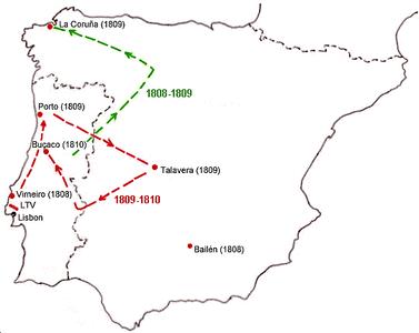 "В сентябре 1808 года 35-тысячная армия Мура повела наступление на Мадрид. Их поддерживала 125-тысячная испанская армия (именно только поддерживала, т.к. не была полностью регулярной и боевые качества ее были не высоки). Французов теснили у реке Эбро. В Париже Наполеон заметил по этому поводу, что его армией там командуют, очевидно, почтовые инспекторы, и 5 ноября присоединился к своей армии в Испании. Под началом его было 194 тыс. чел., и он пошел в наступление. 4 декабря Наполеон взял Мадрид и повернул на северо-запад, чтобы отрезать англичан от базы в Португалии. Мур узнал об этом и англичане искусным маневром отступили к новой базе в Корунне, попутно предприняв ряд арьергардных действий"