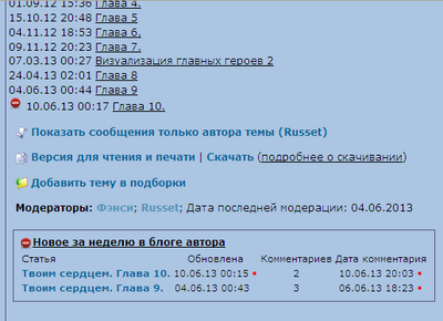 Чтобы ваши читатели не пропустили выкладки новых глав и новых комментариев в ваших блогах, в первое сообщение ваших тем на форуме добавлен блок-спойлер "Новое за неделю в блоге автора". В нем выводятся статьи, которые за последние 7 дней были обновлены или в которых были оставлены комментарии: