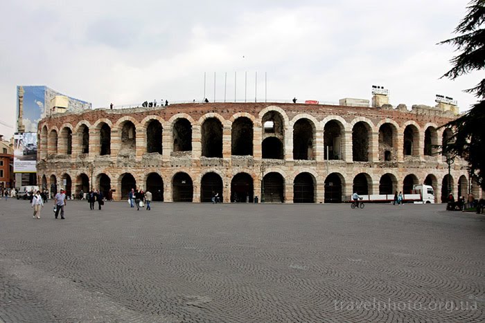 Величественный Амфитеатр - главный, и, вне сомнения, наилучшим образом сохранившийся древнеримский монумент Вероны, более известный в Италии под названием Арена. В античности здесь шли бои гладиаторов, цирковые спектакли различного рода, ристалища, морские бои (навмахии), для чего "сцену" целиком заливали водой. Арена, возникшая в 1 веке н.э., состояла из четырех эллиптических колец с внутренними осями в 44 и 74 метра и осями внешними (включая исчезнувшее кольцо) в 109 и 139 метров. Из мраморных блоков строители высекли сорок четыре ряда. Амфитеатр включал в себя и наружное овальное кольцо, от которого в настоящий момент остался лишь небольшой фрагмент, так называемое "крыло" с четырьмя арками на каждом ярусе. За минувшие века Амфитеатр погрузился в землю на два метра.