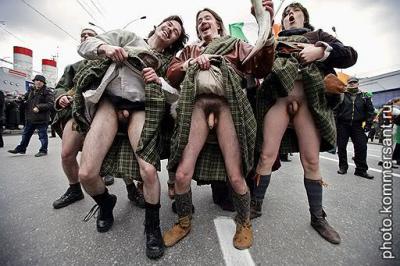 О традиционных возможностях килта: !) пугать соперников 2) ловить кайф самим, в надежде, что среди зрителей окажутся женщины. Любимое занятие шотландского мужчины – задирать свою юбку. Скромники стоят при этом задом, но отчаянные храбрецы не собираются стесняться божьих даролв.