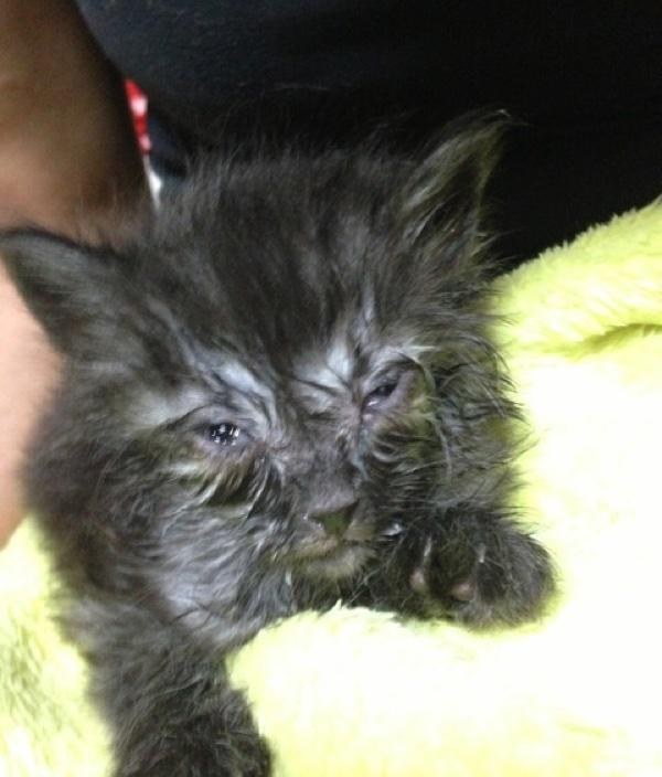 В дождливый майский день двое людей заметили на обочине дороги мокрого и грязного черного котенка. По словам его спасителей, если бы они его не подобрали, он мог и не пережить дождь. Они обтерли его от грязи и котенок тут же сладко заснул