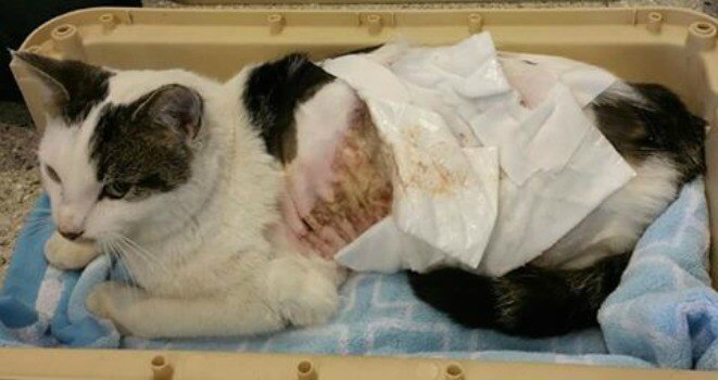 Пострадавший котик был так напуган, что еще пару дней скрывался от спасателей. Трудно представить, что этот малыш пережил. Но, к счастью, спасатели из Felines & Canines (Чикаго) сумели найти мурлыку и оказать ему помощь.