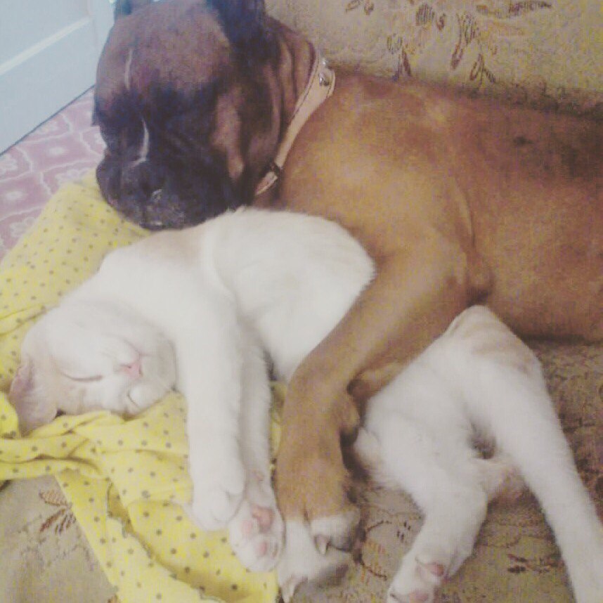 Сейчас киса в порядке, и даже завела себе лучшего друга — того самого пса-боксёра!