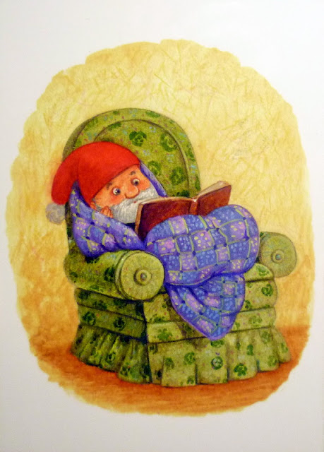 Рисунок называется "Интересная книжка", художник Надежда Баландина, и гном ярко иллюстрирует, как надо читать интересные книжки - сидя в глубине кресла (за неимением кресла можно взять диван или кровать), в одеялке)))) Вкусняшек не хватает рядом (но кто знает, может, они уже внутри?)) Лика, спасибо! Прелесть!