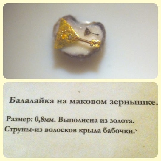 Но и мой муж на свой Canon, даже через микроскоп, спасибо ему большое. Комната для выставки квадратная, небольшая. По периметру столы с микроскопами. В центре полукруг из таких же столиков с микроскопами с подсветкой. Ну и люди, люди, люди... Все стучатся попами)) наклоняясь к микроскопам. Всё было до такой степени интересно, что уходить приходилось только после настоятельных просьб служащих выставки. Очередь была большая, так нужно же было всё рассмотреть, сфотографировать и ещё раз рассмотреть). И матрёшек в скорлупе кедрового орешка. И икону Богородицы в серебряном окладе. Трёх богатырей и Джоконду. Про жука в кандалах подальше будет. Золотой поезд на человеческом волосе. И балалайка на половинке макового зёрнышка. Самая маленькая в мире колода карт. И снова матрёшечки, уже поближе. Ой! А это маковое зёрнышко, на его половинке уместились аж три машины. А на срезе финиковой косточки символ-жезл Гермеса кажется, поправьте, если ошибаюсь...
