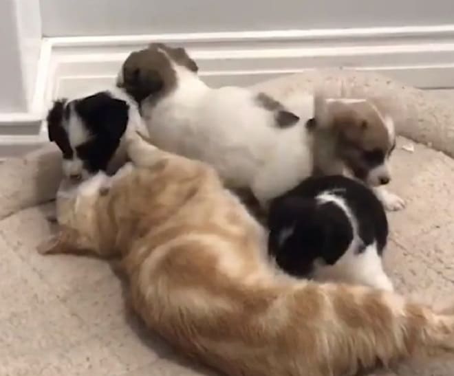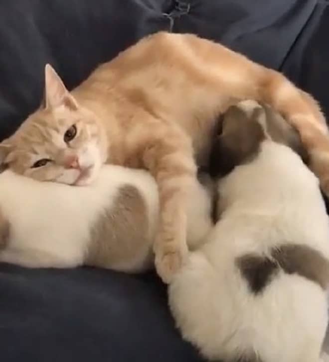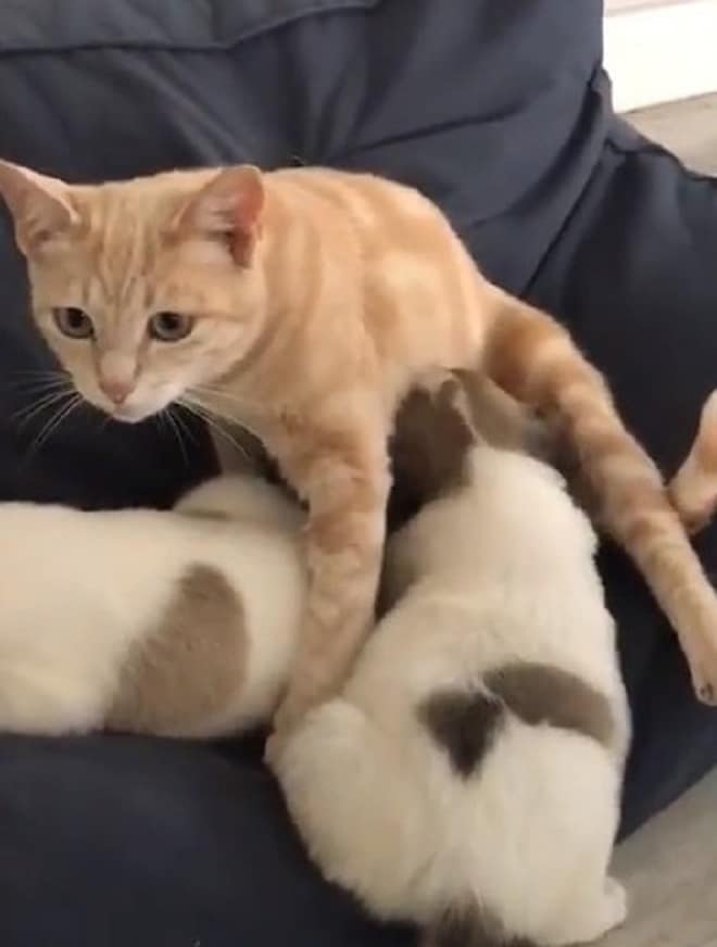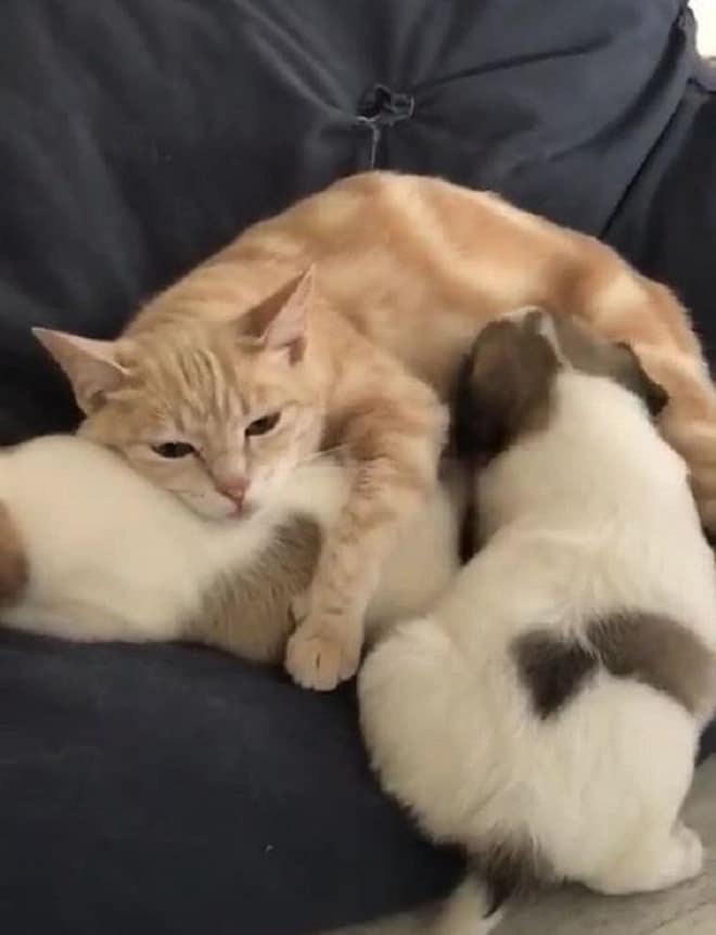 И идея оказалась удачной! Как только мурлыка увидела крошек, она тут же подошла к ним и стала облизывать, будто это ее родные котята. На тот момент у нее все еще была лактация, и щенки стали пить молоко! По всей видимости, Катрин приняла малюток за своих котят, и очень обрадовалась. А может быть, нереализованные материнские чувства мурлыка перенесла на щенков? Так или иначе, все остались довольны: и кошка, которой нужно было подарить свою любовь, и щенки, для которых забота так много значила…