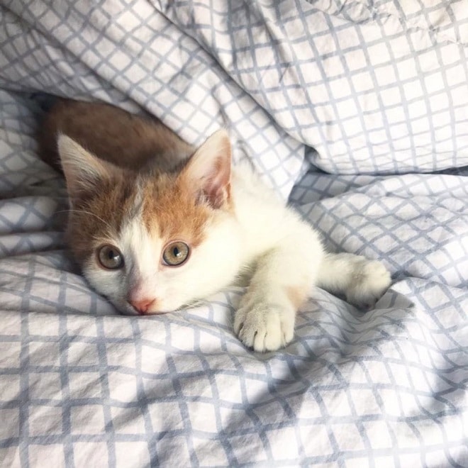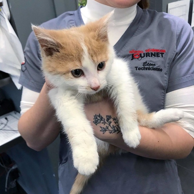 Несмотря на все усилия, один кроха проиграл битву за жизнь. Остался лишь единственный белый котёнок с рыжими отметинами на мордочке и тельце. Он боролся за жизнь всю ночь, а утром ему стало легче. Мишлин решила, что нужно обратиться в местный приют, потому что самостоятельно она вряд ли сможет ему помочь.