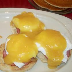 Сваренное «в мешочек» яйцо без скорлупы положить на поджаренный кусочек хлеба с маслом или на выпеченную из сдобного теста лепешку и полить 1 столовой ложкой голландского соуса. Раньше яйцо клали на кусок соленой трески.