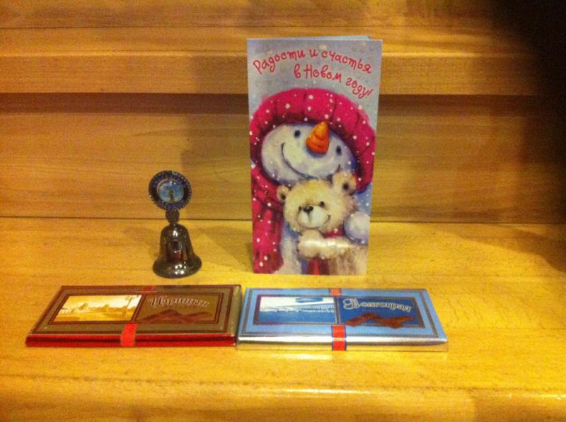 Колокольчик (жаль телефон не передает всю его красоту), шоколад и открытка.