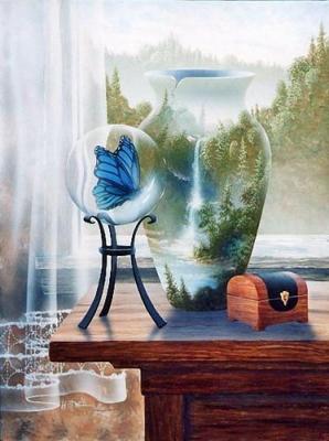 Очень понравились жёлтый натюрморт (с ветками цветущей яблони), светло-сиреневый (где в рюмочке перед вазой водосбор стоит, если не ошибаюсь