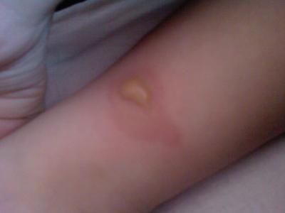 Волдырь лопнулся, присох, но покраснение еще есть. Я так подумала, что волдырь мог быть от того, что расчесали место укуса и под тонкую кожицу набралось воды