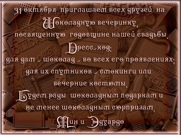 Так вот, сейчас есть такие шикарные платья и разные предметы одежды из шоколада, выполненные искусными мастерами, что просто глаз не отвести. И - они практически не тают. Для дам это будет отличный повод показаться во всем блеске, а мужчинам - можно просто сообщить, что их дресс-код - обязательный смокинг или вечерний костюм. Чтобы они оттеняли собой прелесть и красоту своих спутниц… Ну? Ты видишь - все очень даже прилично, и нет повода беспокоиться.