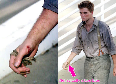 В то время, пока заголовок этого фото гласил, что "Роберта Паттинсона укусил лев", кто-то просто заглянул в отдел косметики в ближайшей лавке, где продают товары к Хэллоуину и прилепил эту рану-обманку на руку Паттинсону. Довольно низко для высоко-художественного фильма, не так ли? Фальшивка это или нет, но мы бы с удовольствием поиграли бы с Робом в медсестру.