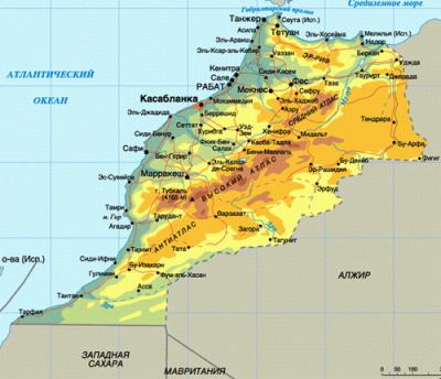 Страна расположена в области слияния Атлантического океана и Средиземного моря. На севере Марокко граничит с Испанией, на юго-востоке – с Алжиром, на юге и юго-востоке – с Мавританией и Западной Сахарой. Гибралтарский пролив, отделяющий Марокко от Испании, достигает лишь 15км ширины. На средиземноморском побережье Марокко находятся два испанских владения – Сеута и Мелилья.