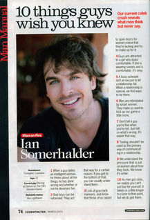 Наш любимец Йен Сомерхолдер появился на страницах американского космо. И не для того, чтобы дать очередное интервью, а поделиться секретами, которые обычные мужчины скрывают от нас! Итак, вот они, страшные тайны мужской половины населения планеты Земля, которые не дают им спать спокойно: