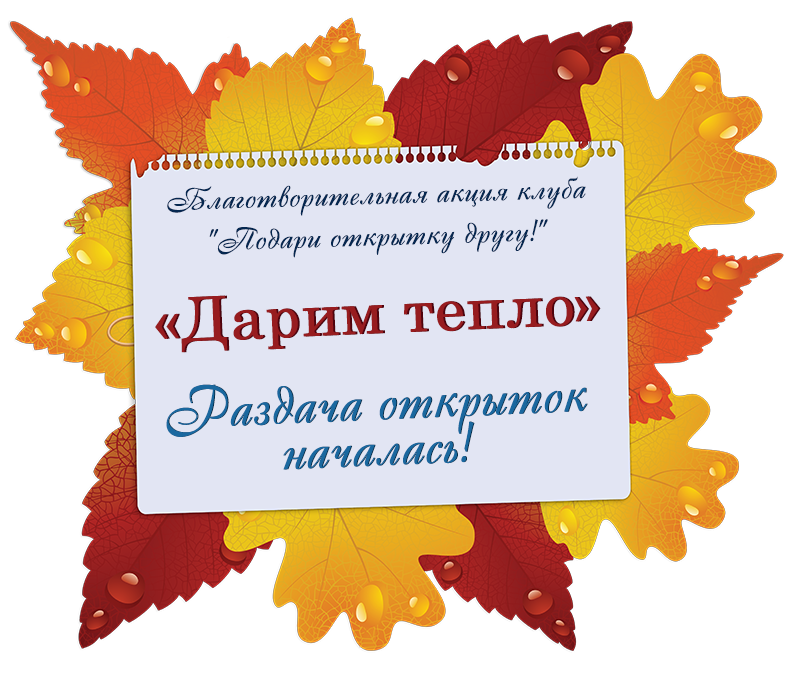 Вот и наступил долгожданный момент начала раздачи открыток в рамках акции "Дарим тепло". Любой пользователь форума может выбрать благотворительную открытку и получить ее по почте вместе с теплыми пожеланиями на обороте. Хотя... быть может, вы хотите порадовать открыткой друга или родственника? Можно выбрать открытку для него. Вам нужно лишь указать имя получателя, его адрес и слова, которые желаете видеть на обороте открытки. Спешите! Количество открыток ограничено.