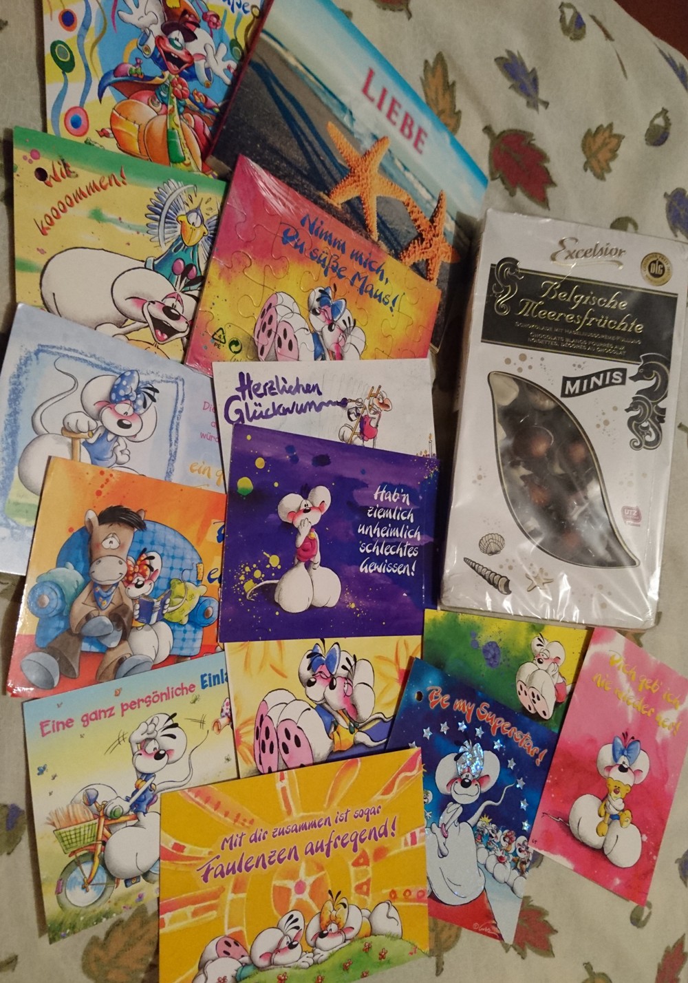 yafor с наклейками и открытками а ещё пахучая шоколадка. Пока могу только нюхать, шоколад незя(((
